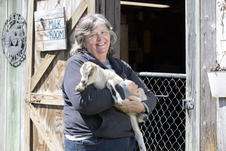 Kris Ellis holds one of this season’s newest arrivals, a kid named Evie. Lamancha dairy goats are recognizable by their tiny pinnae or external parts of the ear. Photo by Erin O. Smith