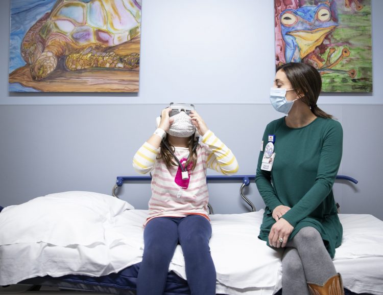 Carson Murray, a patient, tries on the eyepiece as Sarah Beth Gray, a Child Life specialist, explains how it will work for Carson to watch a movie as she received a MRI scan in radiology at Monroe Carell Jr. Children's Hospital at Vanderbilt University Medical Center Wednesday, March 10, 2021 in Nashville, Tennessee.