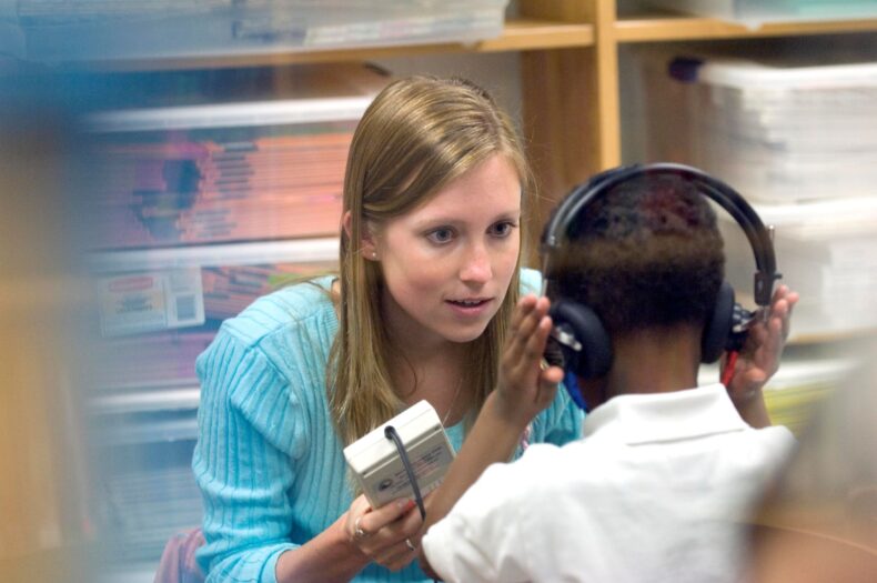 Certified Child Life Specialist (CCLS) Sarah Beth Gray with patient Carson Murray, who is trying on an movie goggles as Gray explains how they will work while Carson undergoes an MRI scan without sedation. Helping patients know what to expect, through preparation using developmentally appropriate language, visual aids, and exploration of equipment, is one of the roles of a child life specialist.