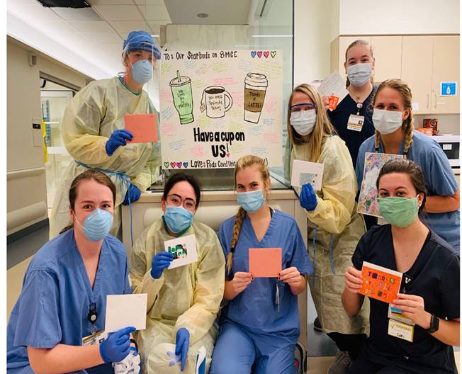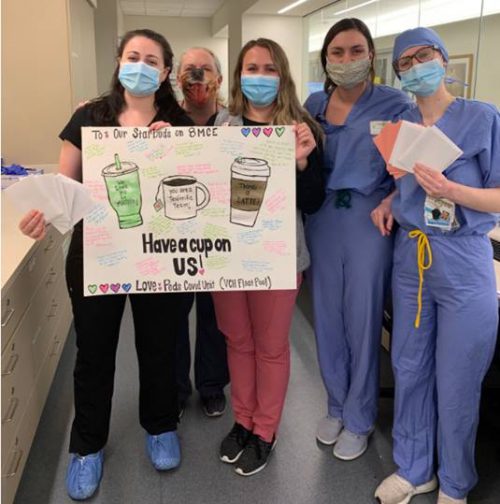She raised funds from the wider community over social media, bought 100 Starbucks gift cards worth $5 each and created a poster board for the unit inviting her adult-side colleagues to “have a cup on us.”