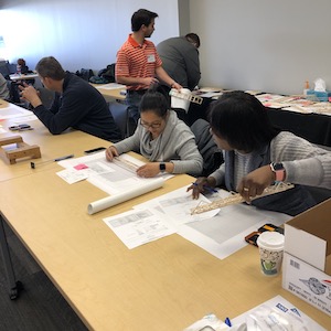 Before testing started ASCE Nashville volunteers weighed and measured 45 model bridges, checking to see whether they met specifications spelled out in the rules for the International Competition. The bridges also had to be built with load-bearing support at three identified locations. A drawing before testing determined all the bridges in Nashville were to be tested at the first spot along the span.