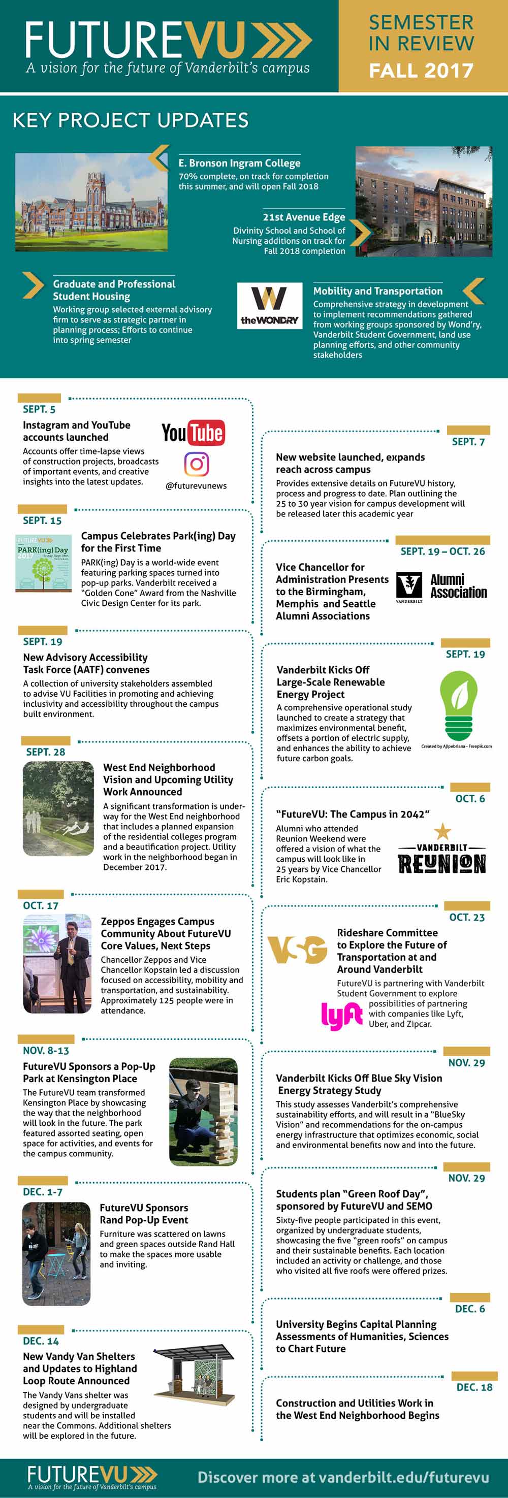• Large-Scale Renewable Energy Study: Vanderbilt is studying options for renewable energy sources, including large-scale solar or wind farms located off campus. An advisory committee was formed in September 2017 and will deliver recommendations this semester.