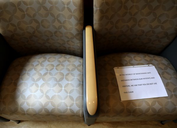 Signs were placed in waiting room seats in The Vanderbilt Clinic to remind patients about the importance of social distancing. Photo by Erin O. Smith