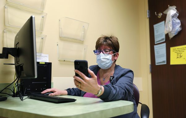 Judy Mazny, LPN, speaks with a patient via a video conference call while looking over the patient’s information at the Eskind Diabetes Center Monday, March 23. The number of patients being seen by providers using telemedicine has greatly increased since the COVID-19 outbreak. Photo by Erin O. Smith