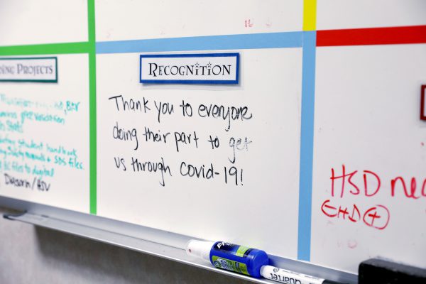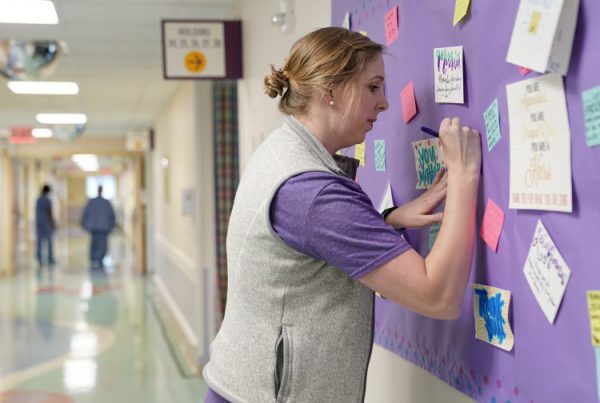 Cory Smeltzer, RN, BSN, a Clinical Staff Leader, helped start and writes on the Kudos Wall set up by nurses in the PACU holding area on the 3rd floor of the Monroe Carell Jr. Children’s Hospital at Vanderbilt. During these challenging times the wall of positive notes allows employees to take a moment to brighten someone’s day, encourage each other, and stay positive. Photo by Donn Jones