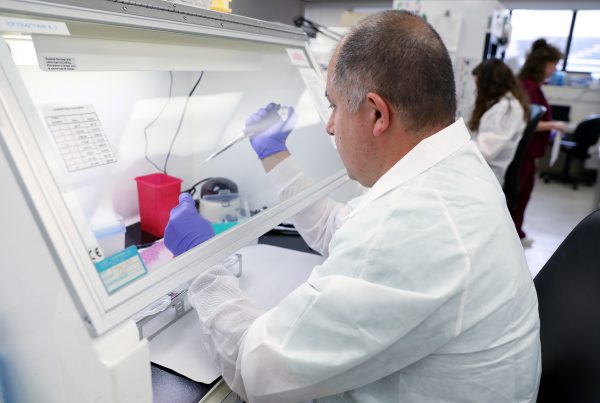 Giovanni Suarez, PhD, a research fellow in Gastroenterology, works on testing specimens Monday, March 30, from individuals who were tested for the coronavirus in The Vanderbilt Clinic. Labor Pool employees have been reporting to VUMC labs to pitch in to process tests. Photo by Erin O. Smith