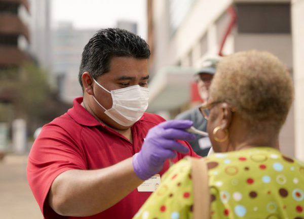 VUMC Valet attendant Oscar Escobar performs a temperature screening on Esther Hightower-Scott, a medical receptionist at VUMC. Valet service was discontinued (except at Vanderbilt-Ingram Cancer Center) in order to allow better social distancing, and many valet attendants volunteered to perform temperature screenings on employees. Photo by Donn Jones