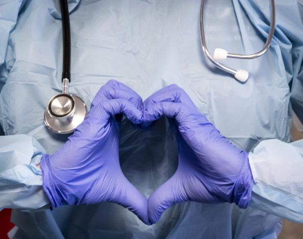 Mary Katherine Rambo of the VUMC Adult Emergency Department sends a message with her gloved hands while working at Screening Center at VUMC. Photo by Susan Urmy
