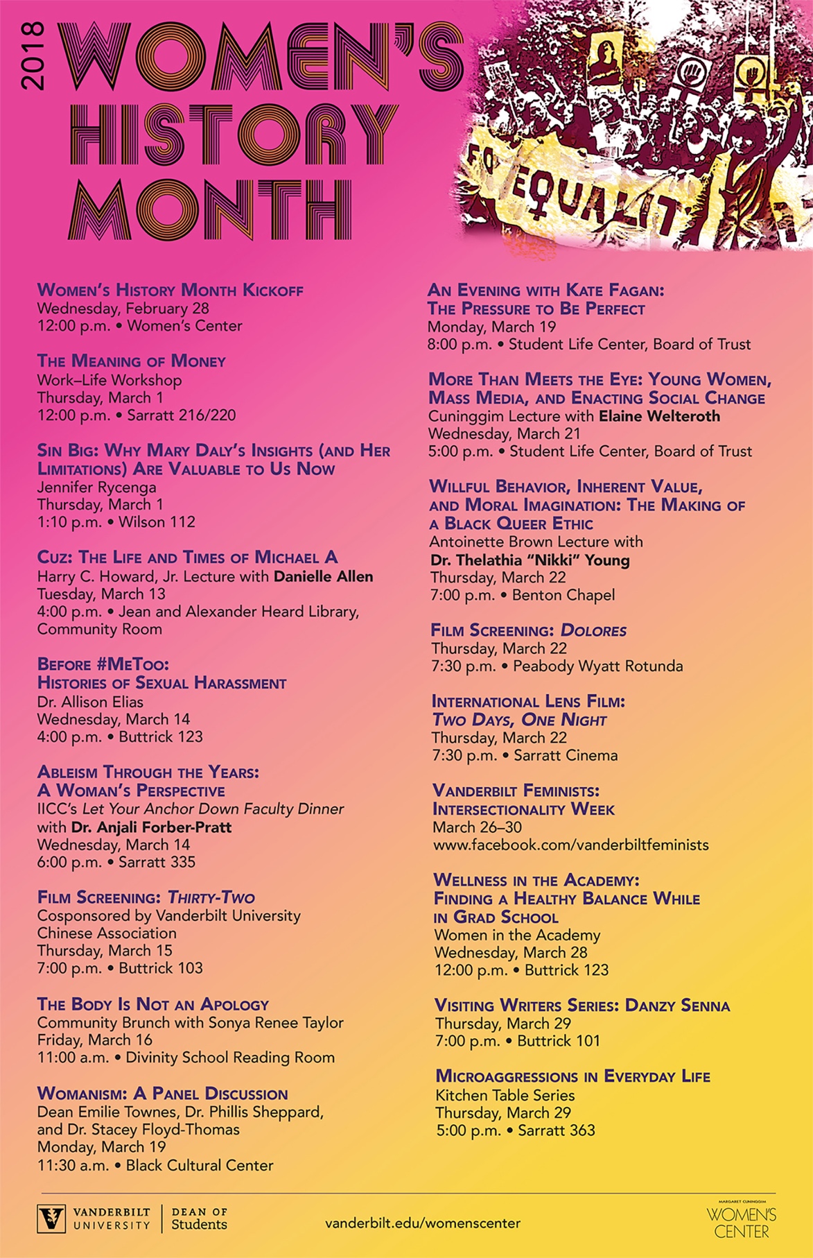 March is Women’s History Month. The Margaret Cuninggim Women’s Center will kick off the month with a celebration from noon to 2 p.m. Wednesday, Feb. 28, at the Women’s Center located on West Side Row.