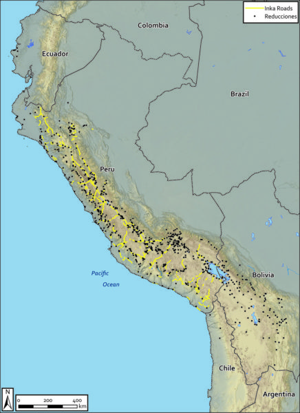 Map showing close relationship between the distribution of reducciones and documented segments of the Inka royal road network. (Wernke et al. 2020)