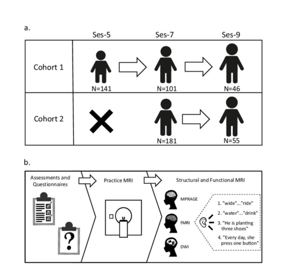 A new comprehensive data set featuring neural images from children ages 5, 7 and 9 has been made available for cross-disciplinary research purposes. Led by James Booth, Patricia and Rodes Hart Professor of Educational Neuroscience in the Department of Psychology and Human Development at Vanderbilt, the brain imaging initiative includes structural and functional magnetic resonance imaging, as well as extensive psychoeducational assessments and in-depth parental questionnaires. The MRI component is unique because it uses multiple tasks that tap into various aspects of language at the word and sentence level (see Figure for an overview of the project).