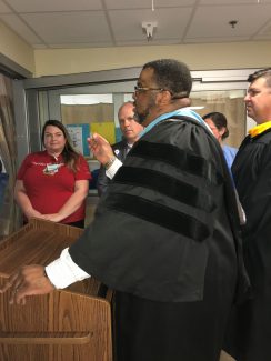 But, unknown to her, behind her room curtain the hallway was abuzz with quiet excitement as medical staff lined the hallways on the 5th floor Cardiovascular Intensive Care Unit. Jaszmon was there, wearing her black cap and gown; the school officials Heaston and Chadwell and the nurses Taylor and Jagoda were out there too.