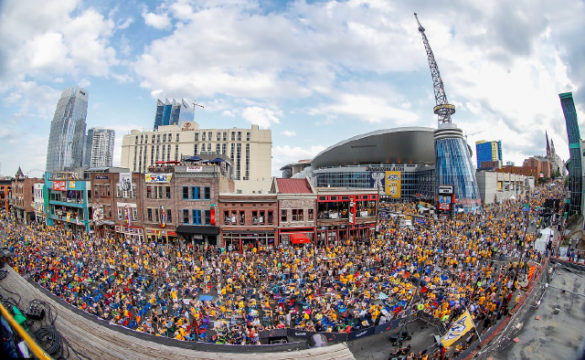 A large crowd fills Broadway before the start of Game Six of the 2017 NHL Stanley Cup Final between Nashville Predators and the Pittsburgh Penguins at Bridgestone Arena on June 11, 2017 in Nashville, Tennessee. (Photo by John Russell/NHLI via Getty Images)