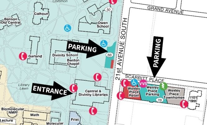 Parking will be available in Lot 6B on the Vanderbilt campus and in the Wesley Place Garage (Lot 7B). Enter the library from the campus side of the building, across from Library Lawn.