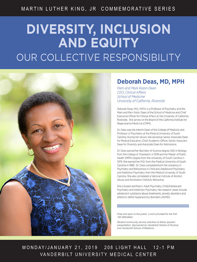 Deborah Deas, professor of psychiatry and Mark and Pam Rubin Dean of the School of Medicine and chief executive officer for clinical affairs at the University of California–Riverside, will discuss “Diversity, Inclusion and Equity: Our Collective Responsibility” from noon to 1 p.m. on Monday, Jan. 21, in Light Hall, Room 208.