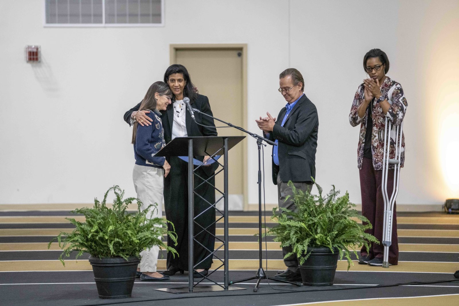 Gail Williams hugs Metro Council Member Burkley Allen in the field house as fellow Council Member Thomas Cash and Associate Vice Chancellor for Student Affairs and Deputy Athletics Director Candice Storey Lee look on, following the reading of a Metro Council resolution in honor of David Williams. (John Russell/Vanderbilt University)