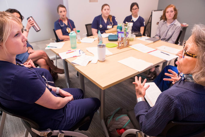 Trudy Hawkins Stringer, associate director of field education and assistant professor in the Divinity School, worked with Stewart and VUSN Assistant Professor Sally Miller to create the simulation exercise. “What we are finding is that there is not a lot of crossover and knowledge about what each profession does,” Stringer says. “We want the nursing students to feel comfortable calling on pastoral services and chaplains to understand more deeply what the nurses do so they can serve the patient holistically.”