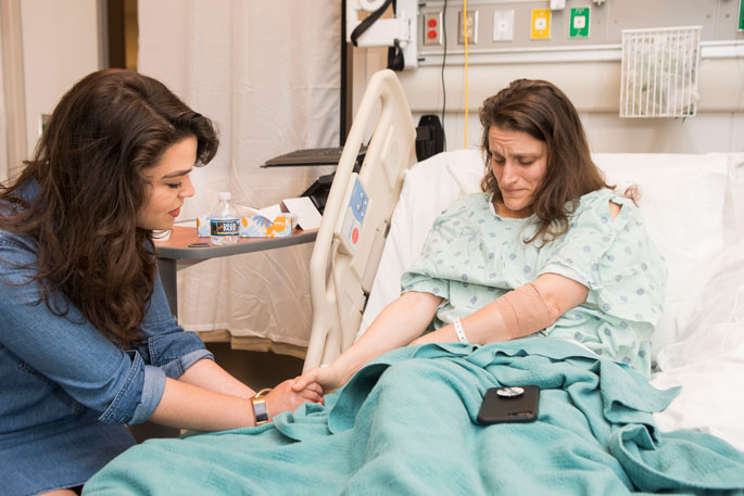 A woman has just delivered a healthy baby, but received difficult news from her caregiver that will impact her health for the rest of her life. As a nurse attends to her physical needs, a chaplain is called in to provide comfort and pastoral care. The patient is relieved and happy her baby is OK, while grief-stricken and consumed by the news of her life-altering health condition.