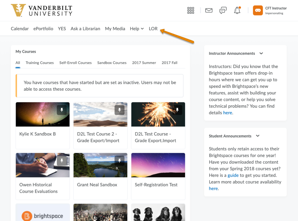1. On the Brightspace homepage, click the LOR link in the Navbar.