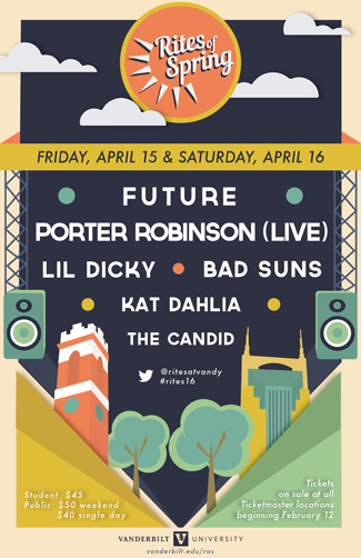 Vanderbilt’s 2016 Rites of Spring music festival is scheduled for Friday, April 15, and Saturday, April 16, on Alumni Lawn. Gates will open at 6 p.m. each evening.