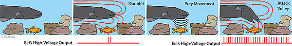 Catania recorded three different kinds of electrical discharges from the eels: low-voltage pulses for sensing their environment; short sequences of two or three high-voltage millisecond pulses (called doublets and triplets) given off while hunting; and volleys of high-voltage, high-frequency pulses when capturing prey or defending themselves from attack.