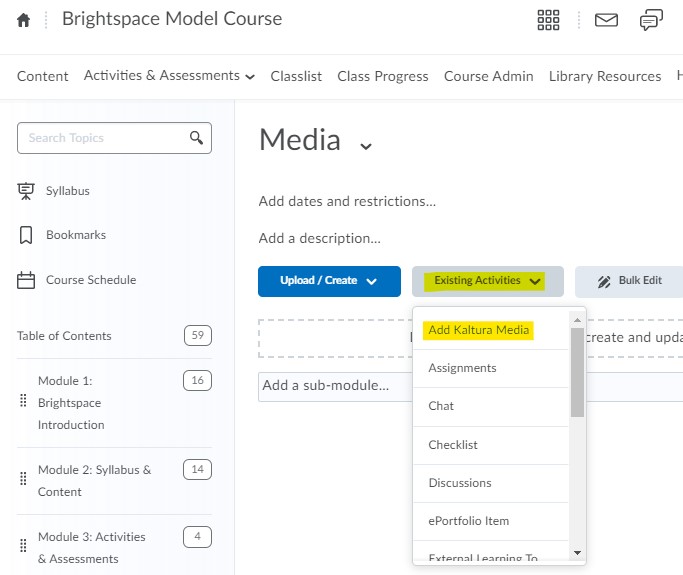 - Click the Existing Activities button inside the module. Then select Add Kaltura Media.