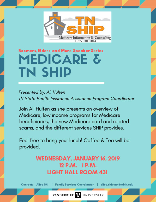 The Vanderbilt Child and Family Center is hosting the Boomers, Elders and More speaker series from January to May 2019. The January event will feature Ali Hulten from TN SHIP, who will discuss Medicare. Please feel free to bring your lunch. Coffee and tea will be provided. Contact Alice Shi, family services coordinator for the Vanderbilt Child and Family Center, with any questions: alice.shi@vanderbilt.edu.