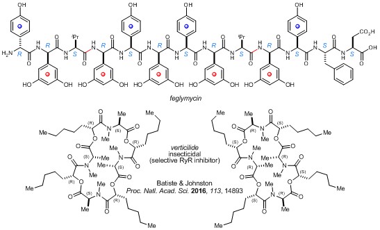 Peptide synthesis | Peptide, peptidic, and peptidomimetic therapies have burgeoned in the past decade, stimulated by advances in drug delivery and challenging, but increasingly tractable, targeted ligand-receptor interactions and disease pathways. Enabled by a discovery in basic amide bond synthesis (Umpolung Amide Synthesis: UmAS), we have streamlined peptide synthesis involving unnatural amino amides by circumventing the active ester intermediate common to all known amide synthesis reactions. This approach provided a new field of opportunity for enantioselective synthesis of nitroalkane derivatives, and it also laid a path to the largest, most complex peptides we have prepared (>2000 MW). Currently, we are advancing on an exciting new hypothesis that cyclic oligomeric depsipeptides might be unique tools for interrogating molecular interactions.