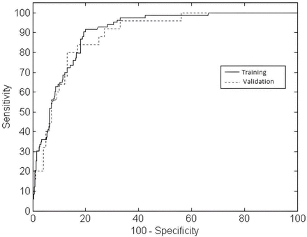Receiver operating characteristic of sensitivity and specificity for the training and validation cohorts. AUCs were 0.91 and 0.89, respectively. AUC, area under the curve.