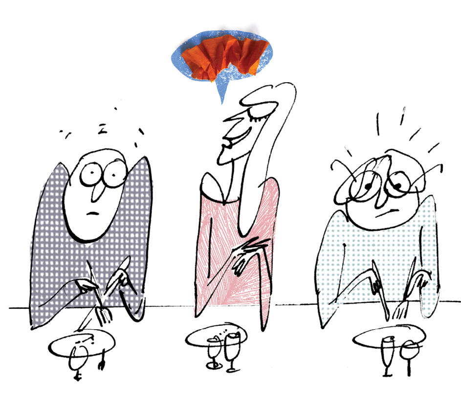 Do not begin to eat until everyone is served. Hold your fork in the left hand and knife in the right. Make pleasant conversation, and ask questions of others—don’t focus just on yourself. Try to include everyone within earshot in the discussion. Don’t talk with your mouth full, and make eye contact. Whatever you do, avoid politics, religion, or any other controversial subjects.