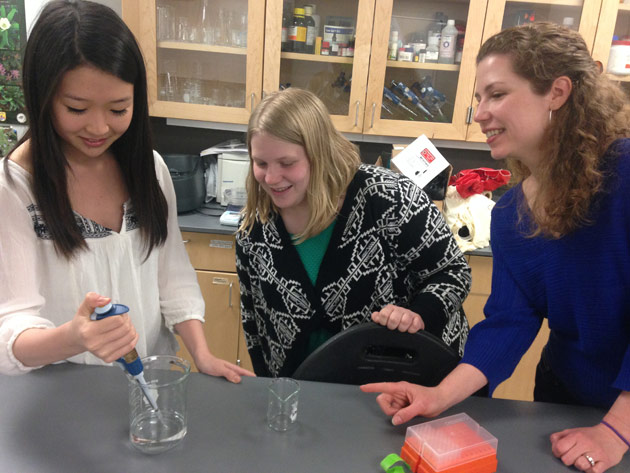 Among those graduating May 10 from the School for Science and Math at Vanderbilt (SSMV) is Chelsea Guo. Valedictorian of the Hume-Fogg High School class of 2014, Guo plans to attend Yale University. Guo (left) is pictured in the SSMV classroom with Emma Bilbrey (center), also a Hume-Fogg senior, who plans to attend Wellesley College, and SSMV Director Angela Eeds (right).