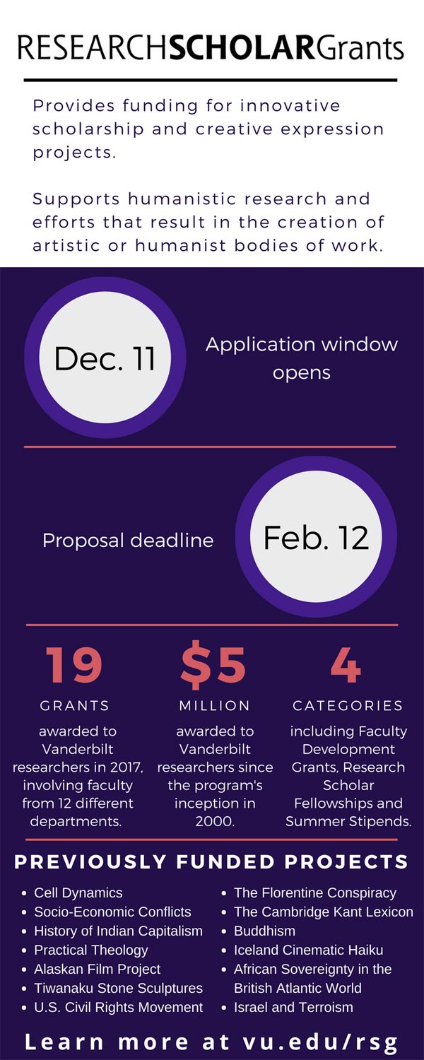 More than $5 million has been awarded to Vanderbilt researchers under the Research Scholar Grants program since its launch in 2000. Last year, 19 Research Scholar Grants projects received funding, including Assistant Professor of Medicine, Health and Society Tara McKay’s research of LGBT rights and health in Mozambique (Faculty Development Grant); Assistant Professor of Religious Studies Anand Taneja’s study of the infrastructure, ecology and religious landscapes of Delhi (Research Scholar Fellowship); and Cornelius Vanderbilt Professor of Sociology Holly McCammon’s research of U.S. women’s legal activism in the judicial arena (Summer Stipend).