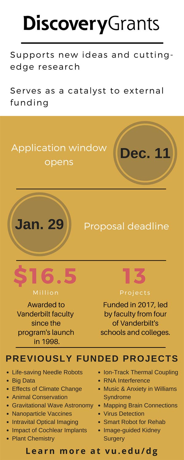 The Discovery Grants program has awarded more than $16.5 million to Vanderbilt researchers since its inception in 1998. Last year, 13 Discovery Grants projects were funded, including Associate Professor of Mechanical Engineering Robert Webster’s needle robots for lung cancer interventions; Associate Professor of Physics and Astronomy Kelly Holley-Bockelmann’s research into gravitational wave astronomy; and Professor of Psychology and Human Development Amy Needham’s research into how infants and toddlers with Down syndrome use objects in learning.