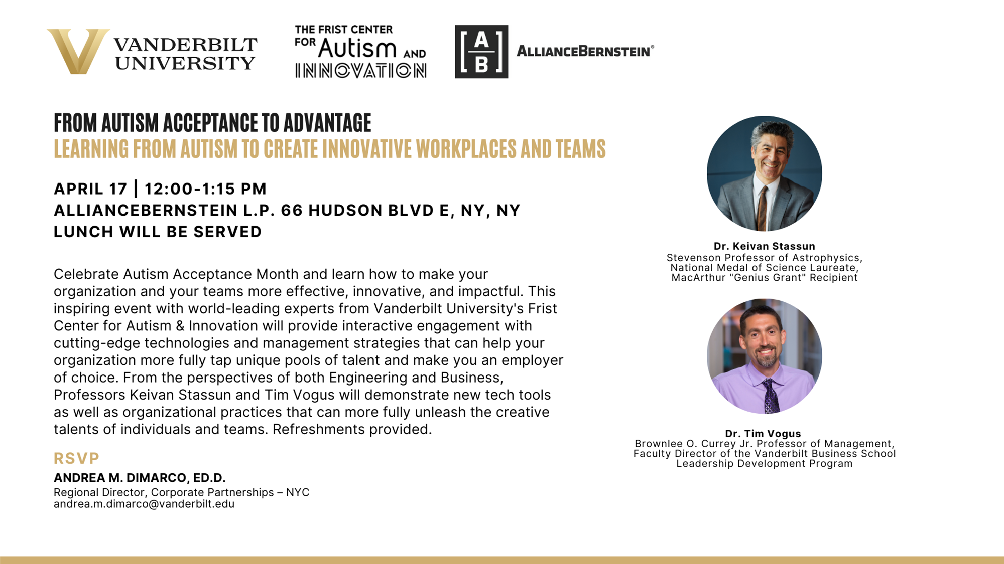 This Autism Acceptance Month, the Frist Center for Autism and Innovation and Vanderbilt University are partnering with Alliance Bernstein to host an NYC event entitled, From Autism Acceptance to Advantage: Learning from Autism to Create Innovative Workplaces and Teams.