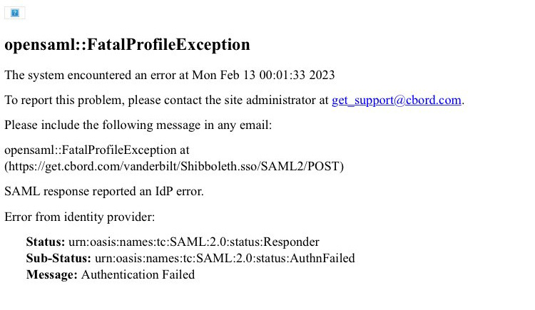 If you see this error below when you try to login to GET (usually you have unsuccessfully tried three times to login) you will see the error below. This means the password you are entering is incorrect. Consistently the best course of action is to reset/change your vunetid password via VUIT's website.