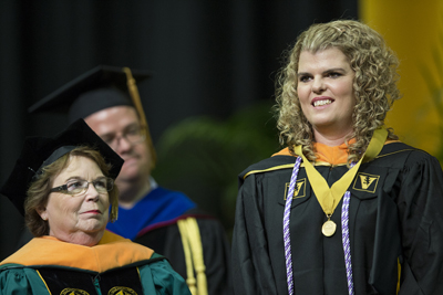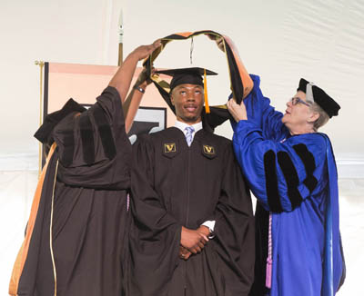 Leithner attended both the Divinity School and the School of Nursing ceremonies, receiving different hoods at each and wearing both an apricot VUSN and a red Divinity tassel.