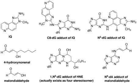 A second major project in our lab involves DNA adducts derived from endogneous sources such as lipid peroxidation. Examples of such reactive electrophiles include alpha,beta-unsaturated aldehydes (acrolein, crotonaldehyde, and 4-hydroxynonenal), 2,3-epoxyaldehydes and dicarbonyl species (malondialdehyde and 4-oxo-2-nonenal). Although these compounds are chemically simple, they react with DNA in a complex and diverse manner. We recently demonstrated that alpha,beta-unsaturated aldehydes can form inter- and intra-strand DNA crosslinks, which are a very severe but largely unstudied form of DNA damage. The crosslinking chemistry is highly dependent on the stereochemistry of the DNA adduct. In collaboration with other laboratories, we are studying the mechanism of the DNA crosslinking reaction and the biological processing of the DNA crosslinks.