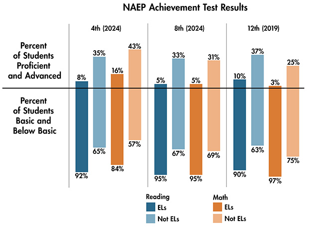 • ELs do not perform as well academically as students who are not English learners. To measure student academic achievement in the United States, the National Assessment of Education Progress (NAEP) administers reading and mathematics achievement assessments to fourth- and eighth-grade students each year and to 12th-grade students every four years. Student performance indicates the degree to which they have acquired the knowledge and skills expected at their grade level. The results are categorized into one of four levels: Below Basic (little mastery), Basic (partial mastery), Proficient (mastery), and Advanced (beyond mastery). The 2024 reading and mathematics results for fourth and eighth grade (and the 2019 results for 12th grade) are compared in the table below for ELs and those categorized as not being ELs.