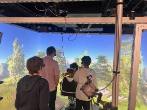 Then, we worked on porting each of our student groups’ Unity projects into our lab’s unique cave environment. By the end of the day, each group’s project was working in the cave with basic camera and motion control and three-dimensional projection using our shutter glasses. The students had added unique visual elements, like mountain-sized monkeys and giant snakes. I think they were all very pleased to see their projects come to life in 3D. (If any students want further access to their projects, they can contact us through SAVY, and we will be happy to provide links.)