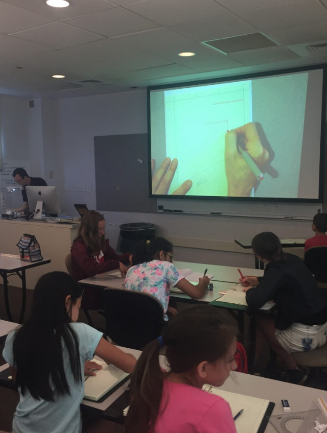 The next mechanism on the agenda is gears. We discussed some basic best practices for designing with gears (a whole number of teeth, please!) and the relationship between gear size (diameter, radius, and circumference) and the number of teeth around the edge. We performed computations for simple gear trains and compound gear trains, and tomorrow we will make a two-view drawing of a compound gear system. Today we built the foundation for this drawing by learning how to use a compass to draw circles, measure and copy distances, and find the perpendicular bisectors of line segments. I look forward to seeing everyone tomorrow as we continue our work with gears!