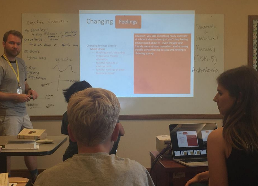 Next, we examined The Cognitive Triangle, a diagram that displays how thoughts, feelings, and behaviors influence one another. Using example scenarios found in everyday life, we then discussed the mechanisms we can use to healthily change one’s thoughts, feelings, and behaviors. The class participated in a “Headspace” mindfulness exercise as an example of a way to calm and improve one’s feelings about a situation.