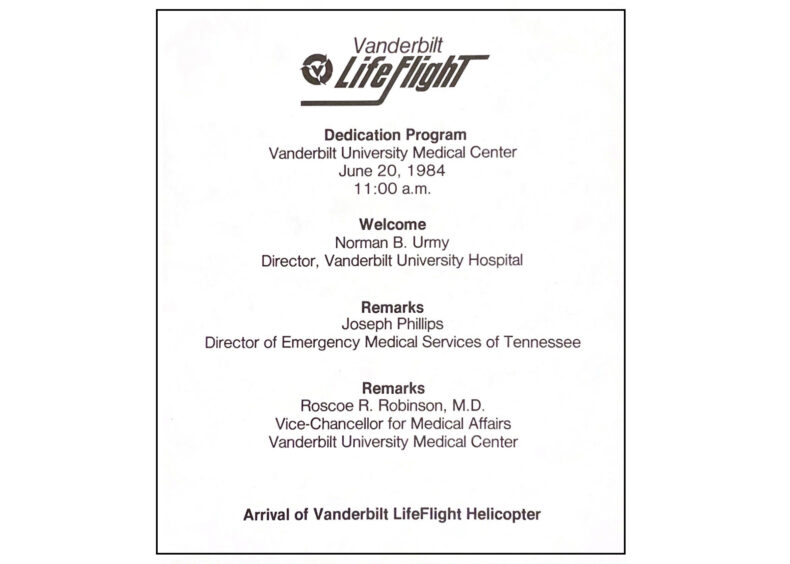 July 5, 1984, marked a major change in trauma care in Middle Tennessee. Before Vanderbilt University Medical Center’s LifeFlight program launched on that date, people who were severely injured anywhere in the small towns, farmland and rolling hills of the region had to travel to Nashville by ground to access sophisticated trauma care. At that time, there was no state-organized trauma system (that didn’t come until 1988), so which patients were selected for transport was not uniformly defined.