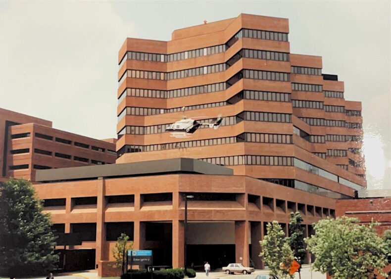 LifeFlight’s first helipad was located on the south end of the VUH Plaza, approximately where the Courtyard Café is now (The Vanderbilt Clinic hadn’t been built yet). For a few months, when TVC construction began, flights would land at a Vanderbilt athletic field, and the patients were transported the final couple of blocks by a waiting ambulance — LifeFlight’s first dedicated ground transport.