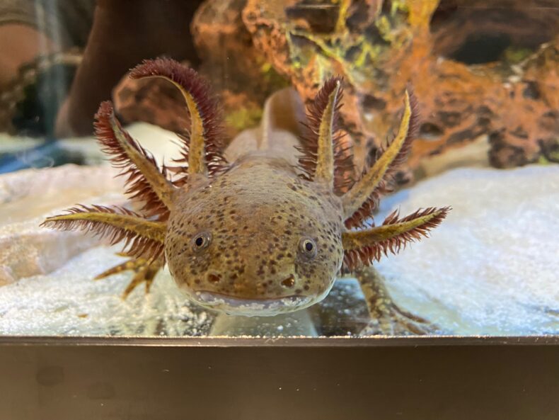 Today’s Salamander of the Day is Penny Peanut, submitted by Nichole Lobdell of Pathology, Microbiology and Immunology. “Penny Peanut is a copper axolotl [salamander]. She is always watching.”