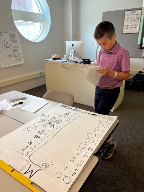 Before lunch, students worked on their Number Systems projects. Each group sent one travelling-student-researcher to explore other groups’ Number Systems. There were special limitations placed on these visits. Traveling researchers were allowed to ask questions only during one of the visits and silently observe during the other. Upon their return, researchers briefed the group members, and the entire group was only allowed to potentially borrow one idea from other mathematical civilizations (other groups). I cannot wait to share photos of our completed Number Systems in our Friday blog because it is going to be epic!