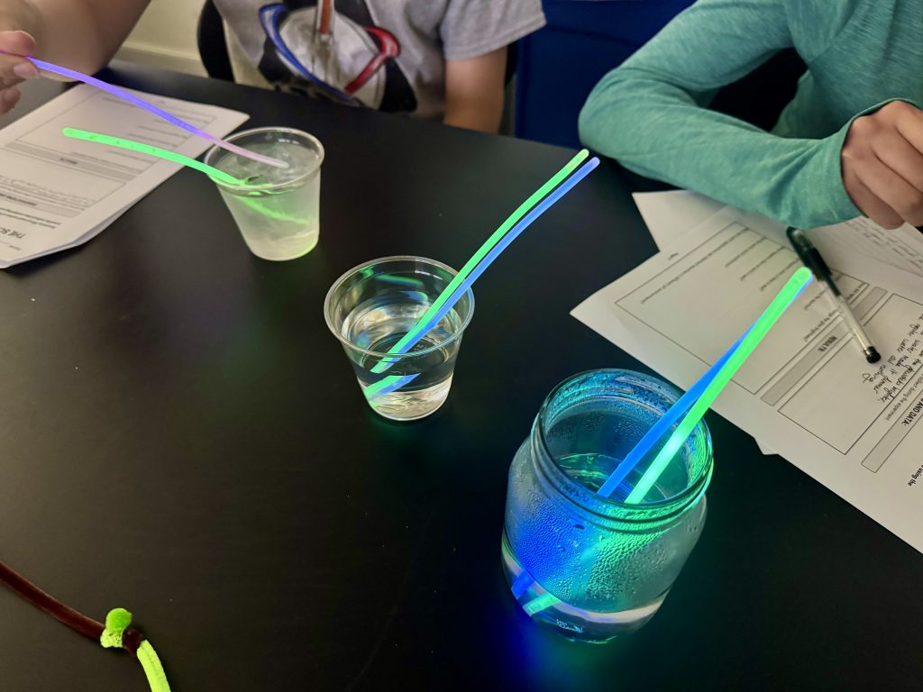 We began our day by diving into different ways light is produced. Students compared incandescence, where heat creates light (like in candles or lightbulbs), with fluorescence, where certain materials absorb energy and quickly release it as light (such as highlighter ink glowing under UV light). They were especially fascinated by chemiluminescence, where a chemical reaction directly produces light, with no heat required, which is exactly how glow sticks work!