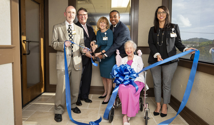 A ribbon-cutting ceremony and open house was held on Aug. 9 to celebrate the opening of a new Vanderbilt Bill Wilkerson Center audiology clinic in Green Hills. Shown here, from left, are Gary Jacobson, PhD; C. Wright Pinson, MD, MBA; Anne Marie Tharpe, PhD; Julian Rodgers, MHA, and Gina Angley, AuD. Seated is Jane Wilkerson Yount, sister of Bill Wilkerson, the namesake of the Bill Wilkerson Center. The clinic, located at 2002 Richard Jones Road, Suite 301c, offers adult patients a convenient new option for hearing evaluations, hearing aid consultations and fittings and other services.