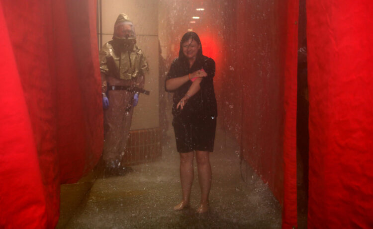 Giant, red tarpaulins were dropped down from the ceiling and attached to the floor to create private shower corridors, with men on one side, women on the other. Patients who could walk – or ambulatory patients – entered the showers from the right side, stripping “contaminated” outer clothing and grabbing soapy sponges from buckets to begin scrubbing beneath the brisk spray.