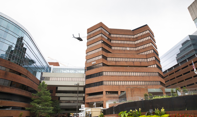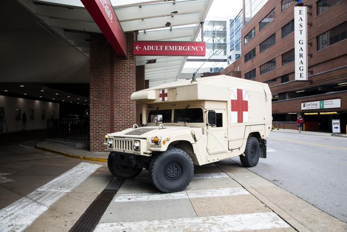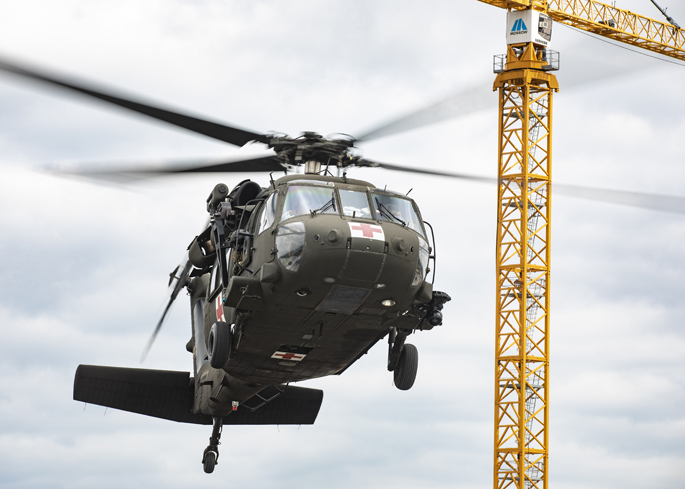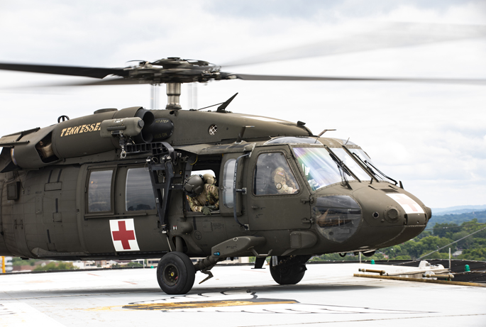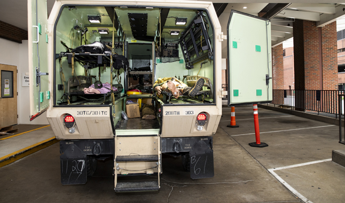 Part of the training used Vanderbilt University Hospital’s (VUH) helipad to conduct touch-and-go landings with Blackhawk helicopters as well as military ambulances transporting simulated patients to the Adult Emergency Department.