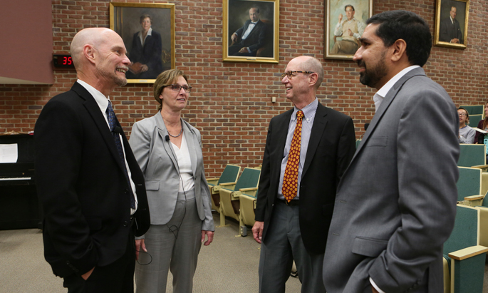 Lawrence Marnett, Ph.D., second from right, dean of Basic Sciences in the School of Medicine, visited with three Vanderbilt University scientists prior to their presentations during last week’s Flexner Discovery Lecture on “cutting-edge” research.